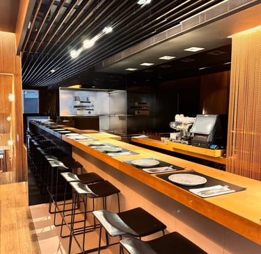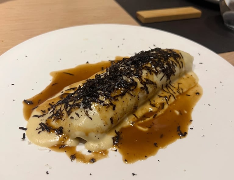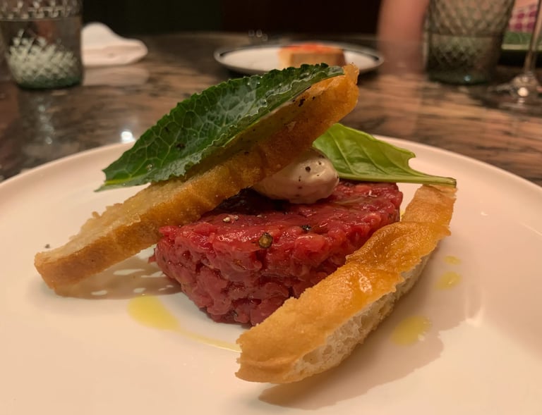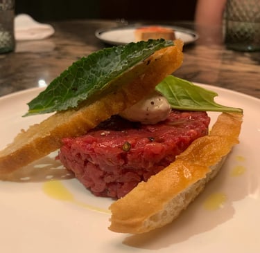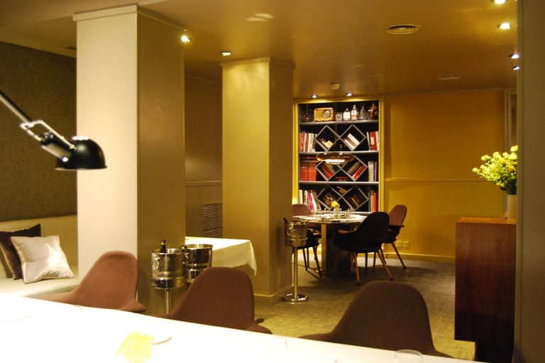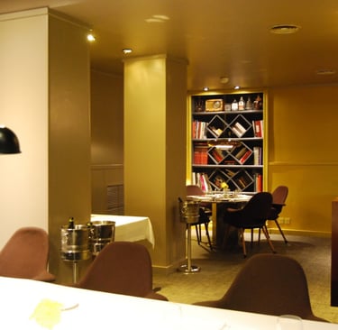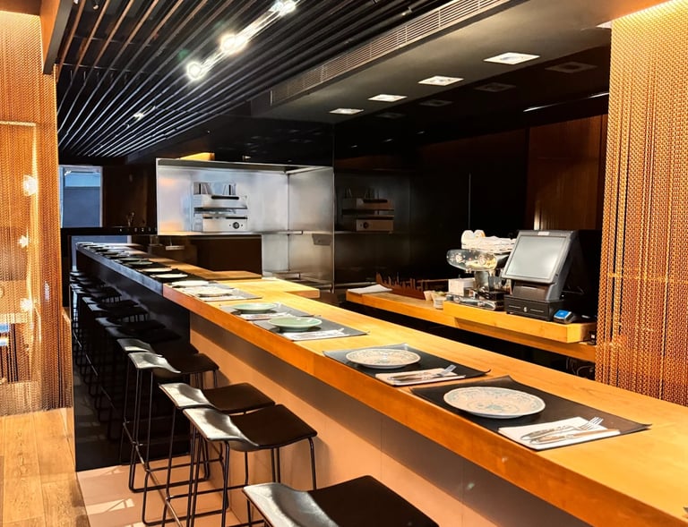 Al acceder, descubrirán una acogedora barra en el nivel de calle, perfecta para disfrutar de tapas creativas en un ambiente desenfadado y cosmopolita. Bajando por la escalera, encontrarán el comedor íntimo en el sótano, un espacio sereno y cuidado donde cada detalle —desde la elección cromática hasta la acústica— ha sido pensado para vivir una experiencia gastronómica en calma y sofisticación.